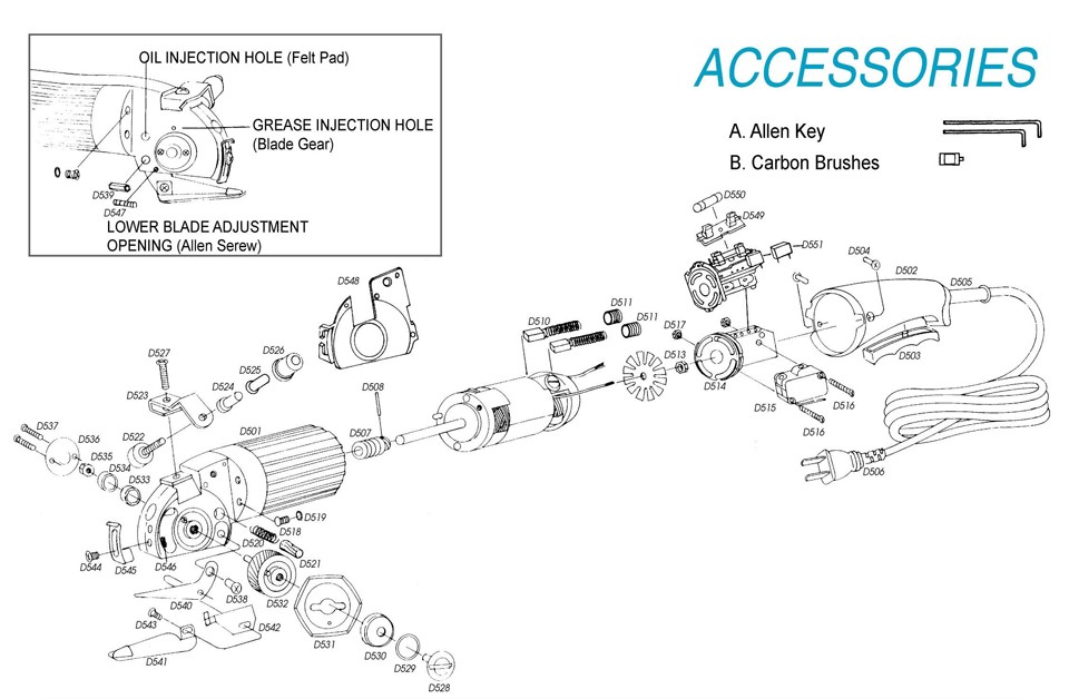 Part-List D-0 Round Knife 2” D527 Set screw for grinder bracket 4x10 D501 Main housing D528 Blade lock screw with tension D502 Rear housing D529 Blade lock screw with tension D503 Switch bar D530 Blade lock screw with tension D504 Set screw for rear housing D531 Hexagonal blade (standard) D505 Cord sleeve D532 Worm gear-plastic D506 Cord complete with plug D533 Ball bearing D507 Worm gear (motor side)--steel D534 Trust collar D508 Roll pin for worm gear D535 Hexagonal nut D509 Motor assembly (100V/220V) D536 Cover plate D510 Carbon brush with spring D537 Set screw 3x10 D511. Screw cap for carbon brush D538 Set screw for counter blade 4x10 D512 Ventilator for motor D539 Set screw nut for counter bladet D513 4mm screw nut for motor ventilator D540 Counter blade D514 Switch D541 Sliding base plate D515 Micro-adjust switch D542 Dust proof metal shim D516 Set screw for micro switch 3x15 D543 Set screw for sliding base plate 3x5 D517 Set screw nut for micro switch 3x5 D544 Set screw for finger guard 4x6 D518 Set screw for main housing D545 Finger guard