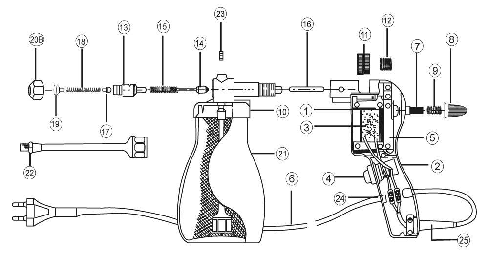 G-1-2 Gun Housing A-3 Electric Drive A-4 Trigger Switch A-5 Silicon Steel Plate A-5B Spring Plate A-6 Electric Lead A-7 Armature Buffer Knob G-8 Volume Control Knob A-9 Volume Control Spring A-10 Front Body A-11 Adjusting Roller A-12 Adjusting Roller Spring A-13 Pump Cylinder A-14 Piston A-15 Piston Spring A-16 Intermediate Push Rod A-17~19 Delivery Valve Cone A-20 Flexible Nozzle Head A-21 CUP A-22 Suction Pipe A-23 Pump Unit locking Screw A-24 Terminal Block A-25 Fixing Rubber YH-20B Adjustable Nozzle Head